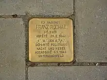 Franz Rochat, a professor, pharmacist, and director of an important pharmaceutical laboratory, was born on 10 March 1908 in Saint-Gilles. He was a worker in the underground press, and the resistance publication Voice of the Belgians. He was arrested on 28 February 1942, arrived at Untermaßfeld in April 1944, and died there on 6 April 1945.