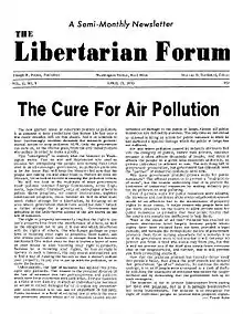 The Libertarian Forum was created in 1969 after the demise of Left and Right: A Journal of Libertarian Thought to support anarcho-capitalism. The focus of the journal was on "substantive theoretical contributions, commentaries on politics, details of disputes and arguments within the libertarian movement, and forecasts on the future of liberty."[2] The original publisher was Joseph R. Peden.