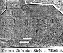 On September 23, 1777, the bishop of the Moravian Church in Bethlehem reported that the wagons had arrived, and all bells except the State House Bell had been moved to Northampton Towne in present-day Allentown. The following day, the State House bell was transferred to the wagon of Frederick Leaser and taken to the historic Zion Reformed Church in Center City Allentown, where it was stored with the other bells under the church's floorboards.[4]