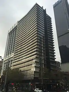 Liberty Tower is located in the "Gdansk"[1] end of Collins street on the north eastern corner of the Collins Street and Spencer Street intersection. The tower was completed in 2002, and is the first project of Melbourne Architect firm Elenberg Fraser. Zahava Elenberg and Callum Fraser of Elenberg Fraser were awarded the commission in 1998 by the Melbourne City Council.[2] At the time, both were still architecture students at RMIT University.[3]