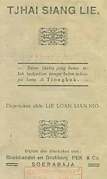 - ↑ "Tjhai Siang Lie : satoe tjerita jang bener telah kedjadian tempo belon sebrapa lama di Tiongkok". WorldCat. Retrieved 27 November 2022.