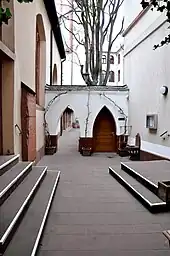 In 1344 the chapel was expanded to a Gothic hall church of three naves.[2] A document about its consecration mentions two altars. From 1415, the south facade was transformed, including a tympanum showing the Adoration of the Magi made by the workshop of Madern Gerthener.[3][4] In 1453 the town council permitted to change an adjacent tower of the fortification to a bell tower. From 1506 to 1509 the church was once more expanded, by Jörg Östereicher.[3] The church remained Catholic, part of the Diocese of Mainz, even when the Reformation was introduced in Frankfurt in 1533.[1]