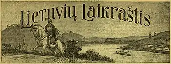 One issue cost 15 kopeks and the annual subscription was 5 rubles.[5] The official editor of the newspaper was K. Narutavičius (first three issues) and later its publisher Smilga. However, the actual editor from January 1905 was Karolis Račkauskas-Vairas who was paid a monthly salary of 60 rubles.[6] The newspaper had two nameplates. The original nameplate featuring Grand Duke Vytautas the Great riding a white horse was not allowed by the Tsarist censors; the Grand Duke was replaced by an oak tree. After the October Manifesto, the newspaper no longer needed approval from the censors and the original nameplate was used.[5] The main censor the newspaper's content was Eduards Volters.[7]