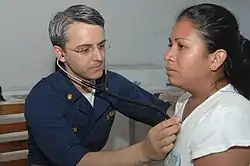 A lieutenant commander providing medical care aboard USNS Comfort (T-AH 20)