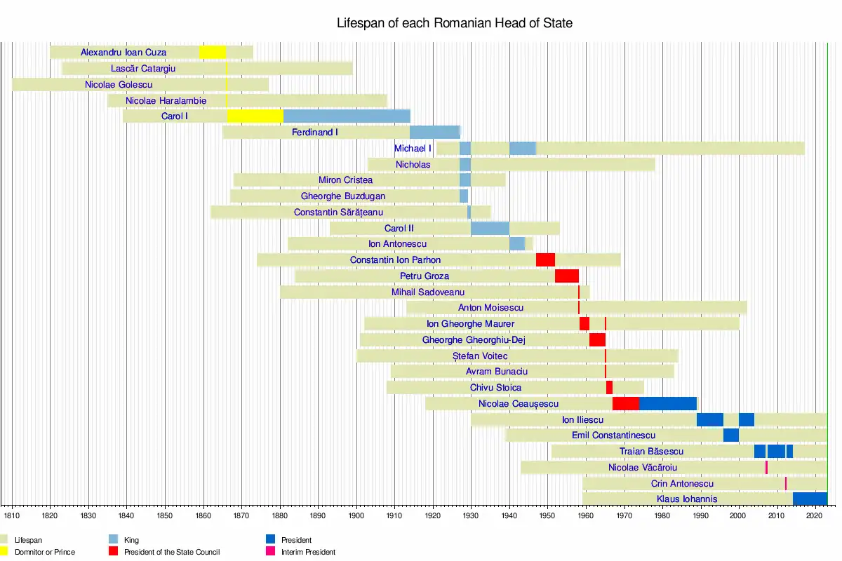 This is a graphical lifespan timeline of heads of state of Romania since 1810. The heads of state are listed in order of office.