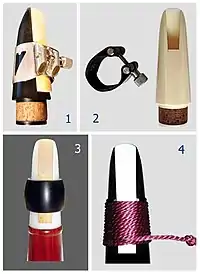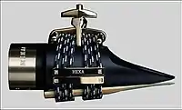 A ligature is a device which holds a reed onto the mouthpiece of a single-reed instrument such as a saxophone or clarinet. The ligature must secure the reed firmly against the table of the mouthpiece while allowing it to vibrate freely.[1] The earliest ligatures were lengths of string wrapped over the reed and tied. Iwan Müller invented a metal ligature to replace twine.[2] String is still used by clarinetists, especially in Germany. Modern German mouthpieces have a groove cut into the outside of the mouthpiece to facilitate wrapping with a string ligature. Some modern clarinetists even opt to use shoestring as a ligature substitute as it is more easily adjustable than string.[3] Other modern clarinetists use electrical tape as a ligature.