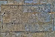 In 1528, D. Miguel da Silva, bishop-elect of Viseu, ordered the construction of the chapel of São Miguel-o-Anjo, which would simultaneously function as a lighthouse in order to assist navigation off the coast.[2] The exterior wall, oriented to the river is a sculpted relief inscription:[2]
