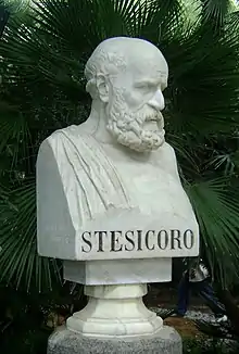 There was no record of title or author but the Doric dialect, the meter and overall style suggested that it was probably a work of Stesichorus, sometime in the first half of the 6th century BC.[8][9] His authorship however was promptly questioned by Bollack et al. (see References) and Parsons also was sceptical, noting the Homeric cliches and "drab, repetitious flaccidity" of the verse.[10] Martin Litchfield West then presented the case in favour of Stesichorus, even turning Parson's arguments on their head and winning over Parsons himself,[11] since ancient commentators had noted the same characteristics that Parsons had found fault with: Stesichorus could be long-winded and flaccid (redundat et effunditur, Quintilian 10.1.62) and "most Homeric" (Όμερικώτατος, Longinus 13.3). However, West was careful not to endorse Parson's low opinion of the fragment's artistic quality.[12]