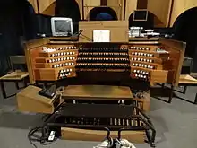 Organ playing is repeatedly documented in the 14th century; in 1443 two organs are mentioned.[2] After several renovations in the 16th and 17th centuries, the main organ was broken in 1749 and Johann Christian Köhler created a new organ (1750–1752). A. and M. Keller of Limburg converted the Baroque housing to a neo-Romanesque style between 1872 and 1877, while retaining Köhler's register. An almost complete rebuild within the neo-Romanesque casing was carried out in 1912 by Johannes Klais, a thorough renovation in 1935 and a neo-Baroque extension in the neo-Baroque style in 1960, by the same organ builder.[3] The current organ was installed in a modern casing in the west gallery by Klais in 1978. The instrument contains over 60 organ stops in four manuals and pedals. The tracker action is mechanical, while the register tracking is electrical.[4]