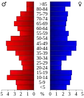 In the county, the population was spread out, with 23.50% under the age of 18, 5.50% from 18 to 24, 22.90% from 25 to 44, 24.60% from 45 to 64, and 23.50% who were 65 years of age or older. The median age was 44 years. For every 100 females there were 96.20 males. For every 100 females age 18 and over, there were 92.40 males.