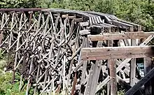 A heavily forested area in an otherwise arid environment, the Sacramento Mountains have long been used for timber harvesting. To expedite the transport of timber to processing facilities and markets, the Alamogordo and Sacramento Mountain Railway was constructed in 1898 by the El Paso and Northeastern Railway, a short-line railroad that connected El Paso, Texas and Alamogordo. A genuine engineering marvel, the Alamogordo and Sacramento Mountain Railway climbed 4,747 feet over 32 miles of track, and included numerous switchbacks, trestles, and grades as high as 6.4%.[8] Though the track was removed in 1948, evidence of the railroad is visible throughout the district. The most visible remnant of the railroad is the 320-foot trestle over Mexican Canyon near Cloudcroft. Crossing 52 feet above the canyon floor the trestle can be seen from vista points on U.S. 82 and by a number of short trails beginning at the Trestle Recreation Area, a day-use facility on the western edge of Cloudcroft. [9]