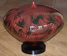 For the next 25 years Tagliapietra worked in association with several of Murano's most important glass factories, including Vetreria Galliano Ferro, Venini & C., La Murrina, Effetre International, where he was Artistic and Technical Director from 1976 to 1989,[5] and EOS Design nel Vetro.[3] At Murrina he developed his "Saturn" design, which became his "personal emblem".[6] His influence on the American art glass studio movement is primarily attributed to his colleague Dale Chihuly. In 1968 Chihuly visited Murano, where he gave Tagliapietra studio time to develop his own pieces. He taught Tagliapietra his techniques, which Tagliapietra taught to other glass maestri, including Pino Signoretto, and Tagliapietra taught Chihuly the Venetians' secrets in turn.[2] A 2001 film documents this collaboration: Chihuly and the Masters of Venice.[7]