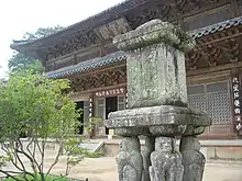 The four lion pagoda is one of the four stone pagodas of Hwaeomsa,[1] positioned 11 m (36 ft) south of Wontongjeon Hall and centrally aligned with the face of the building along a north–south axis.[2] It is composed of a two-tiered platform and a single-story body,[1] made from granite with a total height of 3.43 m (11.3 ft).[3]