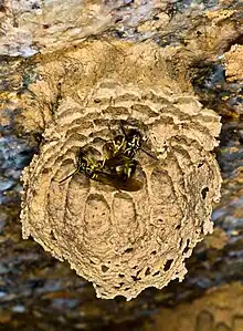 Nests are built under rocks or bridges with water nearby. They are made completely out of mud. Nests are made to house many more wasps than they actually do. Each nest is very underpopulated but it is not fully understood why this is the case. Currently it is believed that female helpers would rather become floaters than be a low ranked helper so most of them will leave the nest. There is also a small chance that a floater will be successful in usurping the position of a wasp in another nest.[6]