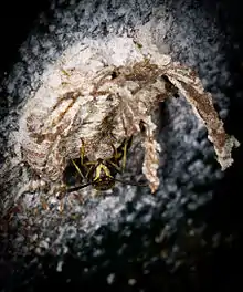 The main predators of these wasps are hornets (especially Vespa tropica), ichneumonid flies, and ants.[5] The hornets attack and damage the nests by ripping the cells apart with their mandibles and then extracting portions of the brood. Raided nests can easily be identified by locating cells that have been ripped or torn.[5] When a hornet or other flying predator approaches, the wasps engage in aerial attacks by throwing themselves into the air in the direction of the potential danger. They actually engage in this behavior very frequently and do so in response to any insect of similar size to hornets that approaches the nests in a questionable manner. When ants approach or invade the nests, the wasps will either grab the ants and drag them away from the nests, or, if the ants are especially large, the wasps will first assume a defensive posture, seize the ants, and then purposely fall out of the nests to ensure the ants are removed.[3] Spiders may also prey on these wasps, but they are much more likely to catch solitary individuals away from the nest.[3]