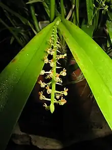 Liparis condylobulbon, commonly known as the tapered sphinx orchid[2] or 细茎羊耳蒜 (xi jing yang er suan)[3] is a plant in the orchid family. It is an epiphytic or lithophytic orchid with crowded, glossy green, cylinder-shaped pseudobulbs, each with two linear to lance-shaped leaves and between fifteen and thirty five pale green to cream-coloured flowers with an orange labellum. This orchid usually grows on trees and rocks in rainforest from Taiwan and Indochina to the south-west Pacific.