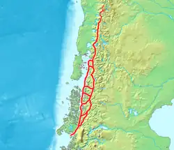 ![]() Approximate extent of the Liquiñe-Ofqui Fault shown in red. Note that it is near parallel to the Peru-Chile trench, the coastline, the Chilean Coast Range and the Andes | |