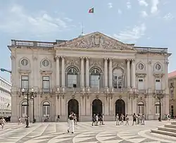 The Lisbon City Hall (Portuguese: Paços do Concelho de Lisboa, lit. 'Palace of the Municipality of Lisbon') is the seat of the Lisbon municipal government. The building is located in the City Square (Praça do Município), Santa Maria Maior, Lisbon. It houses the Lisbon City Council. Built in the neoclassical style, its monumental façade features a large pediment over a central balcony with sculptures by Calmels, and four oculi. Inside, it has a remarkable central staircase, by the architect José Luís Monteiro, and paintings by several artists, like Pereira Cão, Columbano Bordalo Pinheiro, José Malhoa e José Rodrigues.