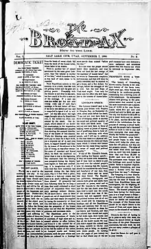 Although new African American newspapers continued to be established in Utah through at least the 1990s, many of the state's historical African American newspapers date to a period of journalistic ferment between 1890 and 1910.[1] During the late 19th and early 20th centuries, the state's African American population grew, reaching 1,144 in 1910.[1] The state's first African American newspapers, The Broad Ax and the Utah Plain Dealer, were both established in 1895, and several others followed soon after. Many of these early local papers were members of the Western Negro Press Association, which held its fifth annual meeting in Salt Lake City in 1900.[1] The Plain Dealer was the longest-lasting of the early papers, running for more than a decade from 1895 to 1909.[2]
