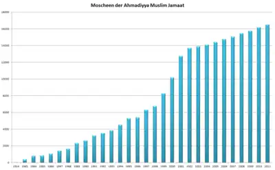 This is a list of mosques, hospitals, schools and other structures throughout the world that are constructed/owned by the Ahmadiyya Muslim Community, arranged according to their respective countries. Additional information pertaining to the countries is also included. As of 2009, the Ahmadiyya Muslim Community has built over 15,055 mosques,[1] 510 schools, and over 30 hospitals.[2][3] The Ahmadiyya Muslim Community is established in 206 countries of the world.[4]
