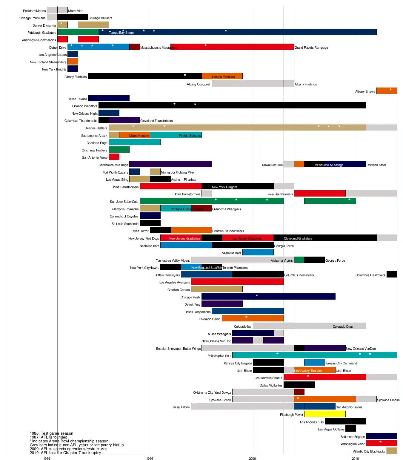 The AFL started play with the 1987 season, featuring the Chicago Bruisers, the Denver Dynamite, the Pittsburgh Gladiators and the Washington Commandos. The Pittsburgh franchise became the Tampa Bay Storm in 1991 – they were the only franchise remaining from the inaugural 1987 season still operating until the 2017 season; after that season, they announced an indefinite suspension of operations, leaving open the possibility of returning in the future if the league were restructured in such a way as to make operation of a franchise potentially profitable.