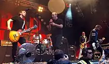 Bentley and later Gurewitz returned to Bad Religion in 1986, with the five-piece lineup releasing three albums in three years before Finestone left again in 1991.[2] He was replaced by Bobby Schayer, whose first album with the band was Generator in 1992.[2] After Bad Religion signed to Atlantic Records and released Stranger than Fiction in 1994, Gurewitz left the band again.[3] Shortly after the album's release, Brian Baker took Gurewitz's place in the group.[4] After three more albums, Schayer departed the band in 2001 due to a shoulder injury, and was replaced by Brooks Wackerman.[5] Around the same time, Gurewitz returned to the band for a third time.[6] Longtime guitarist Hetson left in 2013 and was replaced by Mike Dimkich,[7] and in 2016 Jamie Miller replaced Wackerman after he joined Avenged Sevenfold.[8]
