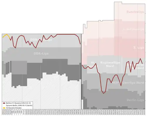 BFC Dynamo was re-branded as FC Berlin on 19 February 1990.[10] The team finished the 1990-91 NOFV-Oberliga in 11th place and just narrowly failed in the play-offs for the 2. Bundesliga. FC Berlin was qualified for the 1991–92 DFB-Pokal. The team was eliminated in the first round by SC Freiburg.[11] FC Berlin fell on hard times after German reunification. The team never made it beyond third tier in the German football league system. BFC Dynamo won the 1998-99 Berlin Cup and qualified for its second appearance in the DFB-Pokal. BFC Dynamo suffered a financial crisis at the end of the 2000-01 season. Insolvency proceedings were opened against the club on 1 November 2001. The team was consequently relegated to the fifth tier Verbandsliga Berlin.[12]