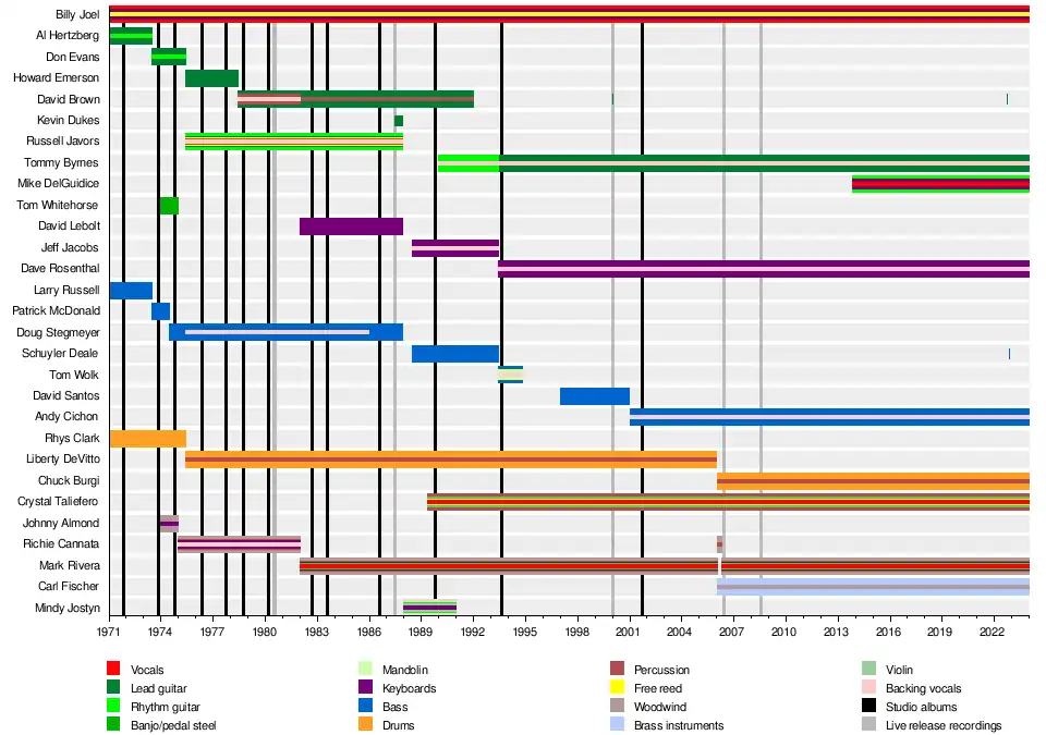 Billy Joel is an American singer-songwriter and pianist who has used various musicians both in studio and for live performances. The band began with the recording of his first album as a solo artist in 1971; it stabilized around 1975 and underwent several lineup changes in the late 1980s and early 1990s. Joel's touring band as a whole did not begin playing on his records until he recorded the album Turnstiles in 1976. This line-up included Richie Cannata on saxophones and organ, Liberty DeVitto on drums, Russell Javors and Howie Emerson on guitars, and Doug Stegmeyer on bass.[1]
