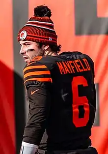 After resuming play in 1999 following a three-year suspension of operations, the franchise has been notable for its instability at the quarterback position.[1][2][3] From 1999 through end of the 2023 season, the team has had 38 players start at quarterback, with only three seasons (2001 with Tim Couch, 2019 and 2020 with Baker Mayfield) where the same quarterback started every game.[1][4]