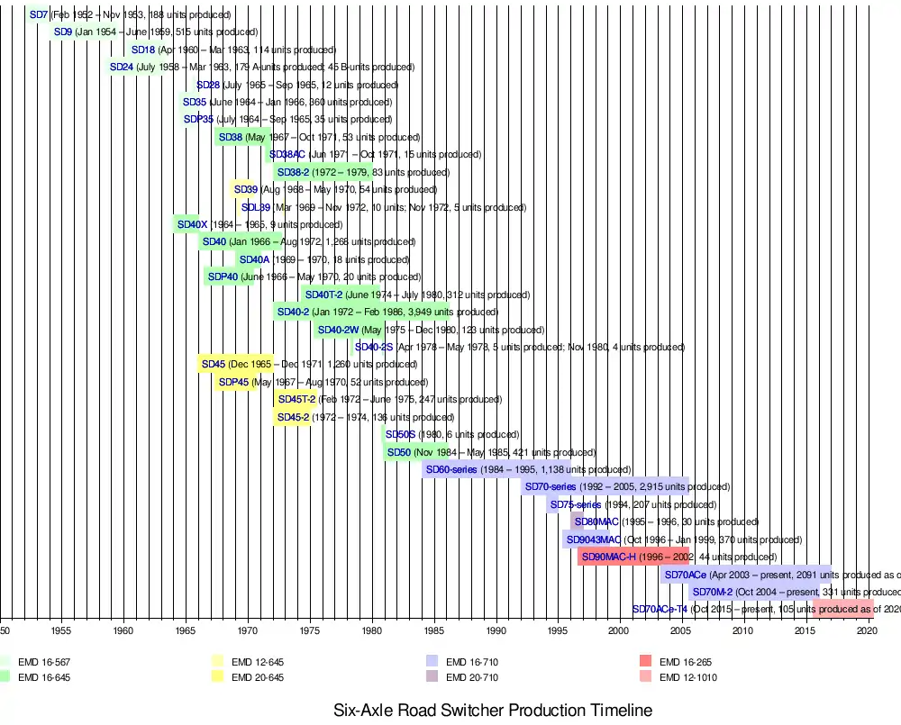 | Model designation | Build year | Total produced | AAR wheel arrangement | Prime mover | Power output | Image |