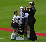 Stoke Ladies F.C. were the first known winners of a women's national knockout tournament in 1922, the English Ladies Football Association Challenge Cup,[8] played under an effective ban on women's football by the FA. The renamed Dick, Kerr team, Preston Ladies, faced Edinburgh for a (British) cup named the Ladies' Football World Championship, on at least two occasions in the 1930s. Preston won in 1937 by a 5–1 score,[9] but the trophy went to Scotland in 1939, when Edinburgh won the title, beating Preston 5–2 in an apparently longer club competition.[10][11][12]