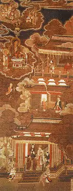 | Illustration of the Visualisation Sutra 観経十六観変相図 kangyō jūroku kanhensō zu | 1323 | Kyoto | Chion-in | ![]() | 224.2 centimetres (7 ft 4.3 in) by 139.1 centimetres (4 ft 6.8 in) | 35°00′22″N 135°47′02″E / 35.006167°N 135.783849°E | [3] | |