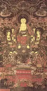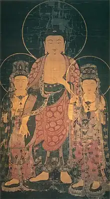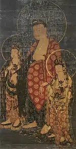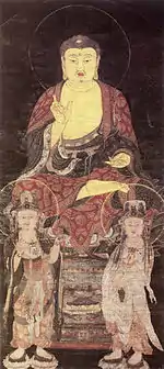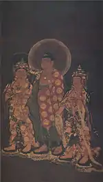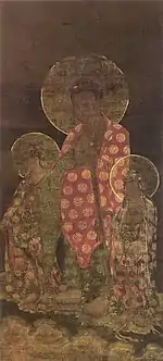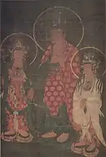 - 1 2 3 絹本著色阿弥陀三尊像 [Amida Triad, colour on silk] (in Japanese). Agency for Cultural Affairs. Retrieved 26 October 2013.