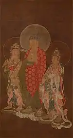 | Amitabha Triad 阿弥陀三尊図 Amida sanzon zu | late Goryeo | Sakai | Hōdō-ji (法道寺) | Municipal Cultural Property | ![]() | 166.4 centimetres (5 ft 5.5 in) by 88.8 centimetres (2 ft 11.0 in) | 34°27′50″N 135°31′04″E / 34.463931°N 135.517731°E | |