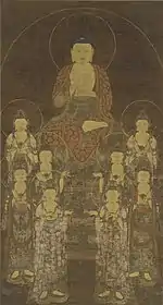 | Amitabha with Eight Great Bodhisattvas 阿弥陀八大菩薩像 Amida hachidai bosatsu zō | late Goryeo | Kyoto | Jōkyō-ji (浄教寺) | ![]() | 173.1 centimetres (5 ft 8.1 in) by 91.1 centimetres (2 ft 11.9 in) | 35°00′10″N 135°46′02″E / 35.002863°N 135.767219°E | [3] | |