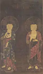 | Avalokitesvara and Ksitigarbha 観音地蔵像 Kannon Jizō zō | late Goryeo | Gujō | Ana-in (阿名院) | 90.2 centimetres (2 ft 11.5 in) by 45.0 centimetres (1 ft 5.7 in) | [12] | |||