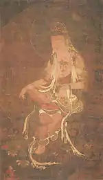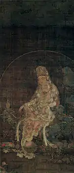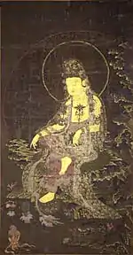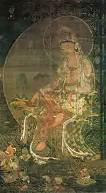 | White-Robed Avalokiteśvara, colour on silk 絹本著色白衣観音図 kenpon chakushoku Byakue Kannon zu | 1377 | Nara | Nara National Museum | white-robed and seated on a grass-covered rock; according to the fifth chapter of the Mahavairocana Sutra, the white is the "whiteness of the pure aspiration of enlightenment"; ink inscription in the upper right corner: 稽首淨聖甘露除焔 | 眞大依怙普施福縁 | 丁巳仲夏 | 壽峯海燁謹題; stylistic considerations date 丁巳 (Yin Fire Snake according to the Sexagenary cycle) to 1377; of Goryeo, Yuan or Ming origin; Important Cultural Property[17][18] | ![]() | 99.1 centimetres (3 ft 3.0 in) by 40.3 centimetres (1 ft 3.9 in) | 34°41′01″N 135°50′12″E / 34.683564°N 135.836678°E | |