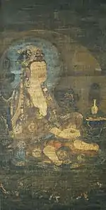 | Amitabha Triad, colour on silk (Mahasthamaprapta) 絹本著色阿弥陀三尊像 kenpon chakushoku Amida sanzon zu | 1309 | Yonezawa | Uesugi Jinja (上杉神社) | left-hand scroll of a set of three jointly designated an Important Cultural Property[14][15] | ![]() | 148 centimetres (4 ft 10 in) by 77 centimetres (2 ft 6 in) | 37°54′33″N 140°06′15″E / 37.909237°N 140.104072°E | |