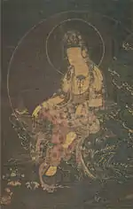 | Water-Moon Avalokiteśvara, colour on silk 絹本著色楊柳観音像 kenpon chakushoku Yōryū Kannon zō 수월관음도 | 2nd half C14 | Nishio | property of Yōju-ji (養寿寺); kept at the Iwase Bunko Library (西尾市岩瀬文庫) | Prefectural Cultural Property | ![]() | 101.0 centimetres (3 ft 3.8 in) by 56.0 centimetres (1 ft 10.0 in) | 34°52′28″N 137°03′14″E / 34.874388°N 137.053853°E | |