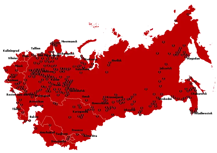 The list below, enumerates the selected sites of the Soviet forced labor camps of the Gulag, known in Russian as the "corrective labor camps", abbreviation: ITL. Most of them served mining, construction, and timber works. It is estimated that for most of its existence, the Gulag system consisted of over 30,000 camps, divided into three categories according to the number of prisoners held. The largest camps consisted of more than 25,000 prisoners each, medium size camps held from 5,000 to 25,000 inmates, and the smallest, but most numerous labor camps operated with less than 5,000 people each.[1] Even this incomplete list can give a fair idea of the scale of forced labor in the USSR.
