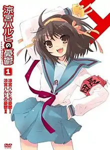 In the original 2006 broadcast of the first season, which aired in Japan between April 2 and July 2, 2006, the episodes were aired in a nonlinear order, with the six episodes making up the first novel's storyline intermixed with episodes based on chapters from various points in the light novels. In the next episode previews, two different numbers for the following episode are given: one number from Haruhi, who numbers the episodes according to where they fit chronologically in the plot, and one number from Kyon, who numbers the episodes in the order in which they aired. The sole exception is episode twelve, which is both the twelfth episode aired and the twelfth episode chronologically, a fact Kyon mentions in the preview.[4] For the DVD releases, "The Adventures of Mikuru Asahina Episode 00" is used as the first episode, but otherwise the episodes follow the chronological order.[5] In the 2009 re-airing, the series was aired in full chronological order, with episodes from the second season mixed in with the first season's episodes based on their chronology. In this airing, the first season's episodes were taken from the DVD editions, featuring visual edits and dialogue changes not featured in the original broadcast.