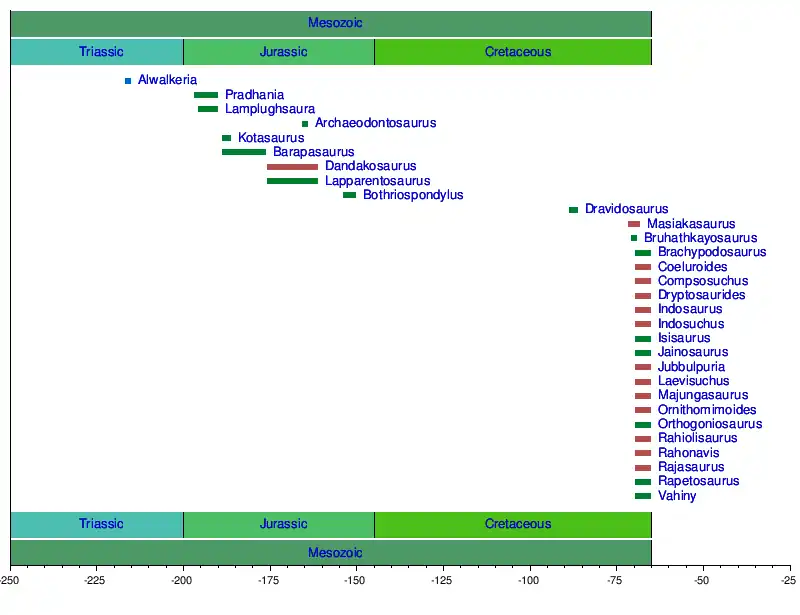 This is a list of non-avian dinosaurs whose remains have been recovered from India or Madagascar. Though widely separated today, the Indian subcontinent and Madagascar were connected throughout much of the Mesozoic and shared similar dinosaur faunas, distinct from what has been found on other modern African and Asian landmasses.