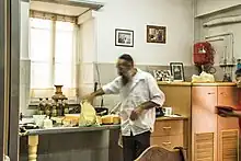 The well known Tzfatit, or Tzfat Cheese, a semi-hard salty sheep's milk cheese was first produced in Safed (Tzfat in Hebrew) in 1840 and is still produced there by descendants of the original cheese makers.[11] Tzfatit began to be produced in 1818 at HaMeiri Dairy, established in the home of Meir Arzoni (later HaMeiri), who immigrated from Persia.[12] Gvina sfattit is a mild curd cheese molded in a basket that gives the cheese distinctive circular striations.[13]