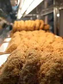 - Korokke (croquette コロッケ): breaded and deep-fried patties, containing either mashed potato or white sauce mixed with minced meat, vegetables or seafood. Popular everyday food.