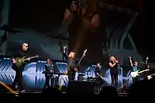 In 1999, Kansas reunited with original lead guitarist Kerry Livgren, who had written and produced demos for several new songs described by drummer Phil Ehart as sounding "like classic Kansas".[26] Recording started in early 2000 for a new album, Somewhere to Elsewhere, at the guitarist's own Grandyzine Studios in Topeka, where the group had originally formed.[27] The album was released in July and also featured original bassist Dave Hope on two tracks, marking the first time the band's original lineup had featured together on a recording since 1980.[28] Livgren remained only for the recording, with the previous lineup of the group returning to tour later in the year.[29]