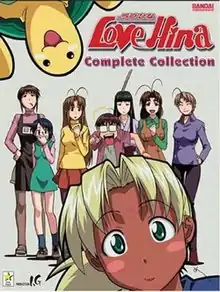 The series was originally licensed in North America by Bandai and released across six DVDs from February 19, 2002 to November 19, 2002.[18] The Christmas special was released on December 3, 2002 and followed by the Spring special on March 18, 2003.[19][20] Love Hina Again was released on September 2, 2003.[21] A box set containing the Christmas and Spring specials and Love Hina Again was released as "Love Hina Movie Set" on September 4, 2002.[22][23] A complete box set of the television series, Christmas Special, Spring Special and Love Hina Again was released on September 28, 2004 as "Love Hina - Perfect Collection".[24] A complete box set of the television series was released on June 27, 2006 as "Love Hina Anime Legends Complete Collection".[25] In July 2007, Funimation Entertainment announced they had acquired the license to Love Hina after Bandai's license had expired, and a box set of the series over 4 discs was released on February 24, 2009.[26][27]