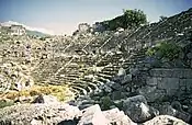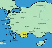 This article contains a list of Lycian place names that have survived from ancient Lycia in Anatolia. Names of settlements and geomorphic features are known from ancient literary sources. Ptolemy's Geography lists places in Asia Minor[1] and specifically Lycia.[2] Strabo's Geography has a section on Lycia as well,[3] as does Pliny's Natural History.[4] Stephanus of Byzantium includes a large number of Lycian places in Ethnica.[5] Hierocles in Synecdemus lists the cities in the eparchy of Lycia.[6] William Martin Leake's Journal of his own trips through Anatolia, as well as of those of many other travellers, with analyses of sources, mainly Ptolemy, is still a valuable source of information on the locations and appearances of the Lycian sites.[7] In addition, numerous inscriptions in the Lycian language state some place names in their Lycian forms.[8] The topographical information comes from the Aydın thesis, and was developed from Turkish military maps.[9]