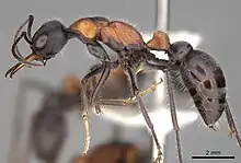 Myrmecia nigriscapa Roger[35] 1861 Colonies of M. nigriscapa are found nationwide, with the exception of the Australian Capital Territory, Northern Territory and Tasmania. Workers measure 17 to 25 millimetres (0.67 to 0.98 in) and dealated queens are 23 to 26 millimetres (0.91 to 1.02 in). The males are smaller, measuring 16 to 20 millimetres (0.63 to 0.79 in). The head, node and thorax is red, and the legs, postpetiole and parts of the gaster are yellowish red. Most of the gaster and scapes are black, and the mandibles and clypeus are reddish yellow.[55]