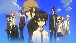 Kouichi Aizawa (相澤 虹一, Aizawa Kōichi) is Rokujou's seemingly 14-year-old classmate who studies Nindō under Kumohira. He is normally portrayed with an energetic attitude around other people, becoming serious and relentless when it comes to ninja duties.[8] He is fascinated with death as a result of his immortality. His immortality is attributed to the holder of the Shinra Banshou during the Edo period, who was a medical practitioner who experimented with placing the wisdom of the Shinra Banshou into animals, since humans usually died. He and Shijima Kurookano are the only survivors of the experiments and gained immortality; they believe that their mission is to observe the end of Nabari.[9] This implies that Kouichi, and subsequently Shijima, are at least a century old. Kouichi's ultimate goal to have the Shinra Banshou release him from immortality and ensure that another immortal being or "monster" like himself is never created again.[10][11] They are together referred to as the Hakutaku (白澤)[12] The Aizawa household are descended from Fuuma ninjas and are native Banten ninja. Kouichi has also confessed his love to Raimei, though she has not yet given him an answer.[13] He is voiced by Satoshi Hino in Japanese and Chris Burnett in English.[7][14]