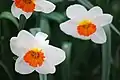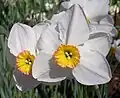 | 9 | Poeticus Daffodil cultivars | Usually solitary flower, with characteristics of N. poeticus, flowers with corona very short to disc shaped, usually green and or yellow centre and red rim (sometimes a single colour), tepals white, usually fragrant | ![]() 'Actaea' 9W–YYR 1927 |